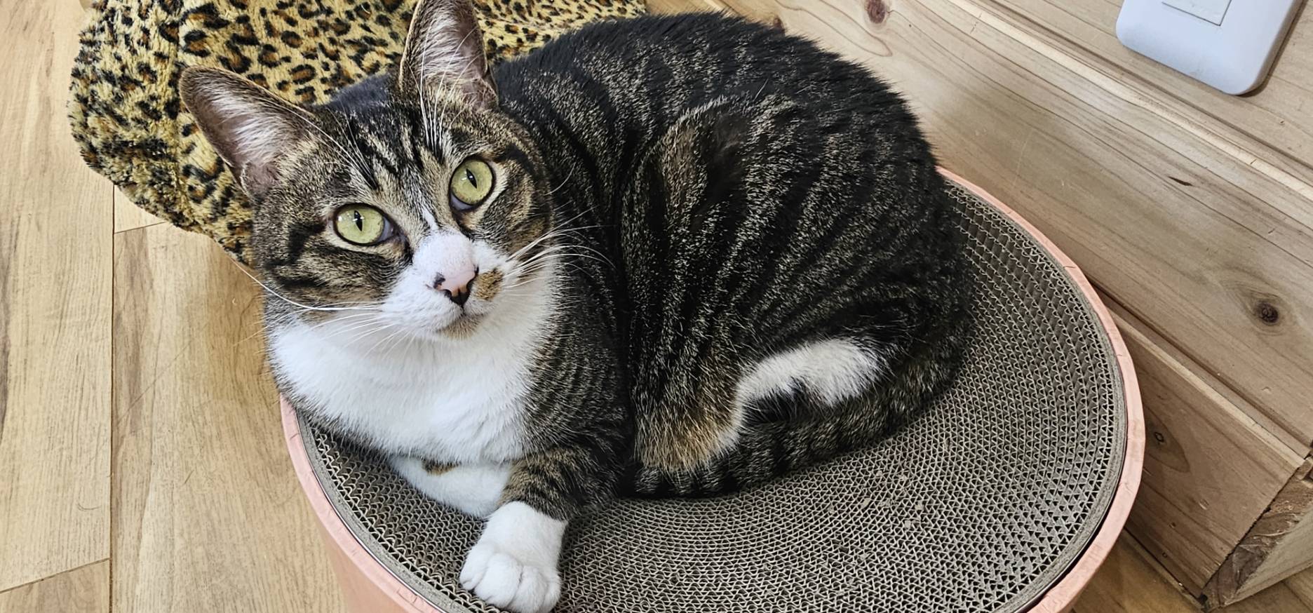 寄付でいただいたボール型の爪とぎ、人気でよくベットにして寝ている子が多いです